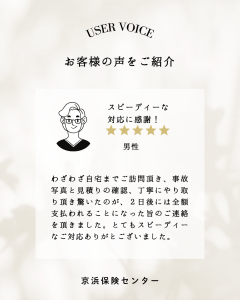 わざわざ自宅までご訪問頂き、事故写真と見積りの確認、丁寧にやり取り頂き驚いたのが、2日後には全額支払われることになった旨のご連絡を頂きました。とてもスピーディーなご対応ありがとございました。